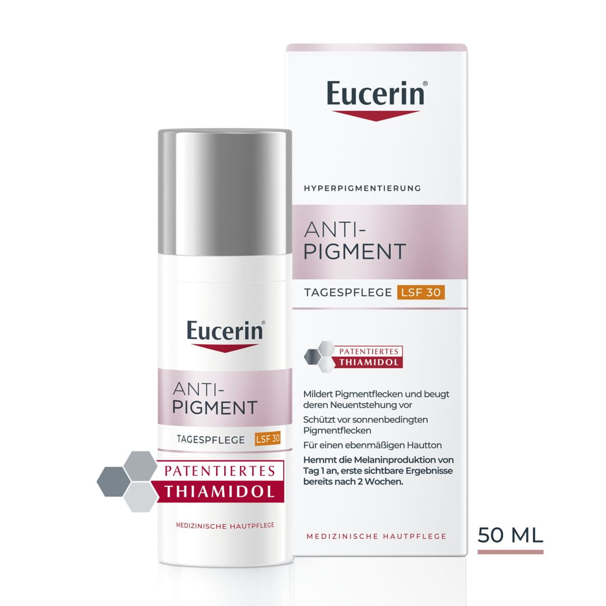 Eucerin® Anti-Pigment Tagespflege LSF 30 enthält Thiamidol®, einen wirksamen und patentierten Wirkstoff, der an der Ursache der Hyperpigmentierung ansetzt, indem er die Melaninproduktion vom ersten Tag an reduziert und bei regelmäßiger Anwendung bereits nach zwei Wochen erste sichtbare Ergebnisse zeigt. Es ist klinisch und dermatologisch erwiesen, dass es alle Arten von dunklen Flecken reduziert und ihr erneutes Auftreten verhindert.