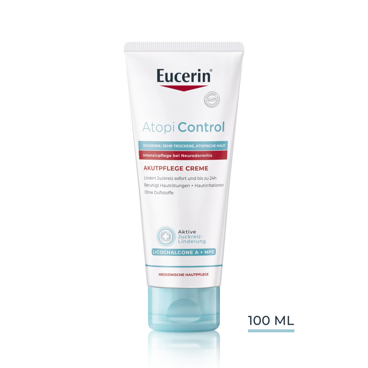 Eucerin AtopiControl Akut-Pflegecreme wurde speziell für die Linderung und intensive Pflege der Haut bei einem Schub von Neurodermitis und atopischem Ekzem entwickelt. Die Formel enthält einen einzigartigen Wirkstoffkomplex aus beruhigendem Licochalcone A, antibakteriellem Decandiol und juckreizstillendem und kühlendem Methoxypropandiol (MPD), der in Kombination mit einer hohen Konzentration an Ceramiden die Hautbarriere stärkt, Trockenheit und Juckreiz auf sensorischer Ebene lindert und so den Drang zum Kratzen reduziert.