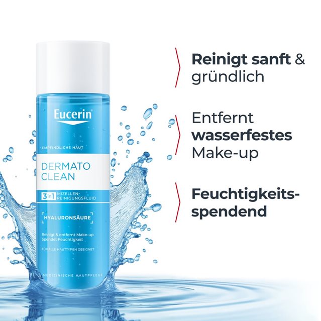 Eucerin DermatoCLEAN [HYALURON] Mizellen-Reinigungsfluid 3 in 1 ist eine schnelle und angenehme Reinigungslösung, die drei Vorteile in einem Produkt bietet: